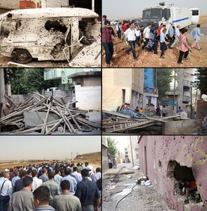 In the late summer and fall of 2015, following the 2014 Kobanî protests and breakdown of the 2013–2015 PKK–Turkey peace process, which were part of the broader third phase of the Kurdish–Turkish conflict, local Kurdish youth and activists, with some of them being affiliated with the Patriotic Revolutionary Youth Movement (YDG-H), and later YPS, organized popular protests, riots, and declared "self-management" in the city of Şırnak.[6][7] On 13 March 2016 military operations by Turkish forces began in the city against supposed "PKK militants." The military curfew imposed on the city was lifted after 246 days. Neighborhoods such as Gazipaşa, Yeşilyurt, İsmetpaşa, Dicle, Cumhuriyet, and Bahçelievler were completely destroyed during the fighting,[8] with allegations of systematic destruction and human rights violations committed by Turkish security forces.[9] Mehmet Ali Aslan, a lawmaker from the pro-Kurdish Peoples' Democratic Party (HDP), stated that around 50,000 people were left homeless in Şırnak and that “no residential areas remained” following the military operation. He told an investigatory committee that the destruction in Şırnak resembled scenes from Aleppo or cities in the West Bank after visiting the city.[7]