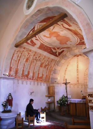 The Church of Saint Stephen the King (سلوڤاكية: Kostol Sv. Štefana kráľa) is the oldest architectural relic of town Zilina,[14] located just 1 كيلومتر (0.6 ميل) southwest from the center. It is one of the first Romanesque churches in Slovakia,[15] dating back to the years 1200–1250, by the experts. The legend goes that the Hungarian King István I himself ordered to build it. Valuable is the inner decoration of the church. Wall paintings originate from approximately 1260; in 1950 they were discovered and later on restored by the Žilina fine artist Mojmír Vlkoláček.[16] Nowadays it is a popular place for wedding ceremonies.