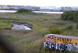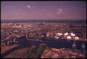 The name Arthur Kill is an anglicization of the Dutch achter kill meaning back channel, which would refer to its location "behind" Staten Island and has its roots in the early 17th century during the Dutch colonial era when the region was part of New Netherland.[2] Placenaming by early explorers and settlers during the era often referred to a location in reference to other places, its shape, its topography, and other geographic qualities.[3] Kill comes from the Middle Dutch word kille, meaning riverbed, water channel, or stream. The area around the Newark Bay was called Achter Kol.[4] During the British colonial era the bay was known as Cull bay.[5] The bay lies behind Bergen Hill, the emerging ridge of the Hudson Palisades which begins on Bergen Neck, the peninsula between it and the Upper New York Bay. The sister channel of Arthur Kill, Kill van Kull refers to the waterway that flows from the col or ridge or passage to the interior and translates as channel from the pass or ridge.