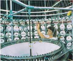 تصنع الآلات اللّحمية غرزًا متقاطعة، وتُنتج أقمشةً مرنة. ومعظم الآلات اللحمية دائرية؛ أي أن إبرها مُرتّبة في دائرة على أسطوانة دوّارة. ومع دوران الأسطوانة تقوم بصنع القماش في شكل أنبوبي. وتُستخدم الآلات الدائرية ذات الأقطار الصغيرة في صناعة الجوارب القصيرة والجوارب النسائية.