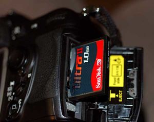 A CompactFlash (CF) card, one of many media types used to store digital photographs