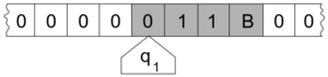 هنا, الحالة الداخلية (كيو1) is تظهر داخل الرأس, و توضح الرسوم , أن الشريط لانهائى و قد ملء مسبقا بالرقم "0", و الرمز يبدو أنه فارغا. والحالة الكاملة للنظام (و التهيئة) تتكون من الحالة الداخلية, مكونات المربعات المظللة و تشمل الفارغةblank التى تم رصدها بالرأس ("11ب"), و بموضع الرأس. (الرسم من وضع منسكى (1967) صفحة. 121).