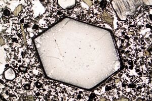 Haüyne crystallizes in the isometric system forming rare dodecahedral or pseudo-octahedral crystals that may reach 3 cm across; it also occurs as rounded grains. The crystals are transparent to translucent, with a vitreous to greasy luster. The color is usually bright blue, but it can also be white, grey, yellow, green and pink.[3][4][5] In thin section the crystals are colorless or pale blue,[5][12] and the streak is very pale blue to white.