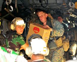القوات المسلحة الإندونيسية تعمل سوية مع أفراد US Marines في توزيع المعونات الإنسانية لضحايا زلزال پدڠ 2009.