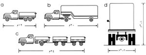 وتتحدد سَعَة الطريق الإنشائية بعرض الطريق، وبارتفاع الحافة السفلى للجسر المار فوقه، وبميول الطريق وبدرجة انعطافاته وبحالة سطحه. ولذلك فإن الأبعاد الحدية العظمى للسيارة مع ملحقاتها المقطورة ونصف المقطورة تحدد في العادة بموجب أنظمة قياسية دولية، ويجب الانتباه لعدد محاور السيارة وحمولتها. ويبين الشكل (2) الأبعاد العامة الحدية بحسب النظام القياسي السوفييتي للسيارة وللقاطرة مع نصف مقطورتها وللسيارة مع مقطورات عدة، وهو مشابه للأنظمة الدولية الأخرى.