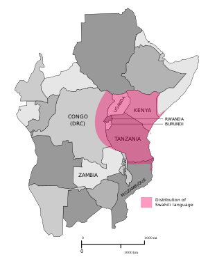 كما وجد أتشيبي في رحلاته أن اللغة السواحلية تتكسب المزيد من التمييز لتكون لغة أفريقية هامة. إذ كان بث قنوات الراديو بالغة السواحلية، كما كان يتم استخدامها بشكل واسع في الدول التي زارها. رغم ذلك، وجد أتشيبي حالة من "عدم الاهتمام" من الناس تجاه الأدب المكتوب بالسواحلية.[64] كما قابل الشاعر الشيخ شعبان روبرت، والذي اشتكى من الصعوبات التي واجهها عند نشر أعماله باللغة السواحلية. [65]