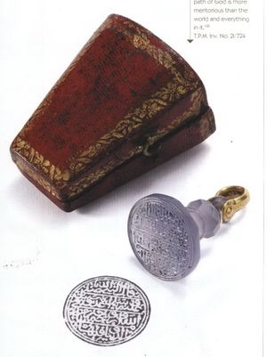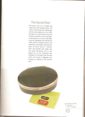 ![]() الختم الشريف وطوله واحد سنتيمتر ومصنوع من حجر كاميليون الأحمر محفور فيه "محمد رسول الله" بالخط الكوفي والختم مثبت على خاتم كان الرسول يلبسه في اصبعه وتوارثه من بعده أبو بكر ثم عمر بن الخطاب ثم عثمان بن عفان الذي سقط منه في بئر ايريس ولم يجده بالرغم من البحث عنه لمدة ايام مما اضطره لصنع ختم مشابه له والذي توارثته الدولة الأموية ثم العباسية من بعده وهذا الختم عثر عليه في بغداد وجيء به الى اسطنبول |