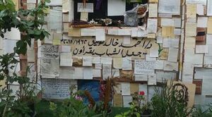 صورة لبعض العبارات والملصقات التي وضعها محبي أحمد خالد توفيق على قبره.