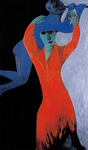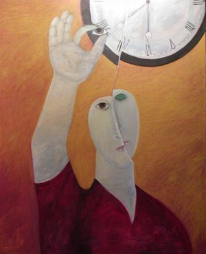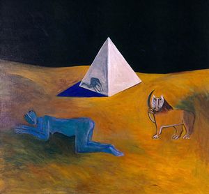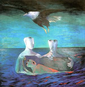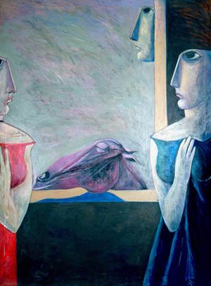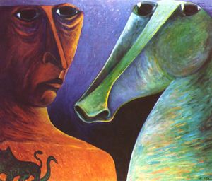 ـ ظاهرة أخرى لم تعد اليوم بحاجة للتأكيد هى قلة احتفال الفنان الحديث بالتزام حدود الأشكال والمقاييس الخارجية الواقعية اليومية المظهر لموضوعاته وفى العالم الذى نراه هنا تقوم مسوخ قميئة شوهاء وإنما هو ينقل لنا اهتمام الفنان بالشىء الجوهرى خلف الظواهر ويلهمنا بجمال غريب في هذه المسوخ هو جمال تشكيلى صرف أساساً لكنه لذلك يبتعث عندنا المحبة القائمة بين الناس في دخيلتهم جميعا فتتحنن قلوبنا أمام هذه القامات الصامته والساكنة التى تنوء بها مأساة وقد غرزت أقدامها في الأرض فنتماسك نحن أيضاً خفية أمام هذه الشخوص المتماسكة التى تحرص على الحياة بعناد ، أمام هذه الوجوه الصلدة الصخرية التى تنهل منها عاطفة مع ذلك أو التى بترت بتراً عن جسومها أو قطعت عنها شرائح اللحم وتراكيب العظام أمام هذه الظهور المنصوبة والأجسام القوية التى اجتثت عنها رؤوسها وهى مع ذلك تختزن ثمرات الحب والحياة في قرارتها ، كأنها تختزن بذوراً صلبة مليئة بالعزم والرغبة في التحرر والانطلاق وصدورنا تنبض بالفاجعة وبالعمق وبالرقة أيضاً.