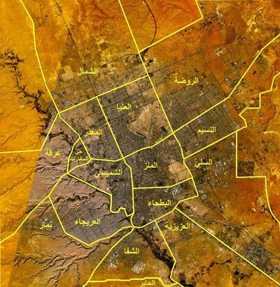 صورة فضائية لمدينة الرياض موضح عليها مواقع البلديات الفرعية الخمس عشرة.