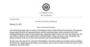 - ^ "واشنطن تطالب أنقرة بـ"الإفراج فوراً" عن الناشط عثمان كافالا". سكاي نيوز عربية. 2021-02-11. Retrieved 2021-02-11.