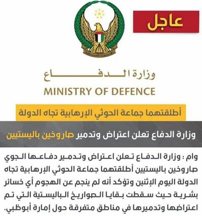 - ^ الجزيرة (2022-01-24). "بعد أسبوع من هجوم أبو ظبي.. الإمارات تعلن اعتراض وتدمير صاروخين باليستيين أطلقهما الحوثيون". www.aljazeera.net.