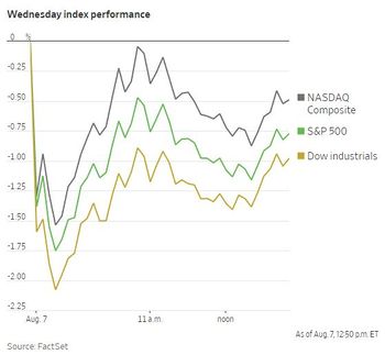انخفضت مؤشرات البورصات العالمية بسبب خفض البنوك المركزية حول العالم لأسعار الفائدة. ففي ألمانيا وصل سعر الفائدة على السندات الحكومية لعشر سنوات (سالب) - 0.587% ، بينما بلغت الفائدة على سندات الخزانة الأمريكية لعشر سنوات 1.6%. ونتيجة لذلك انتشر الخوف من كساد، فانخفض مؤشر داو جونز الصناعي الأمريكي 2.1% ثم استرد بعض ما خسر ليقف عند خسارة 1% في الواحد بعد ظهر الأربعاء.