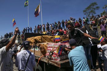 شاحنة معونات ومعها أفراد من شعب پمون تنتظر على الجانب البرازيلي من الحدود مع ڤنزويلا، في انتظار السماح لها بالدخول.