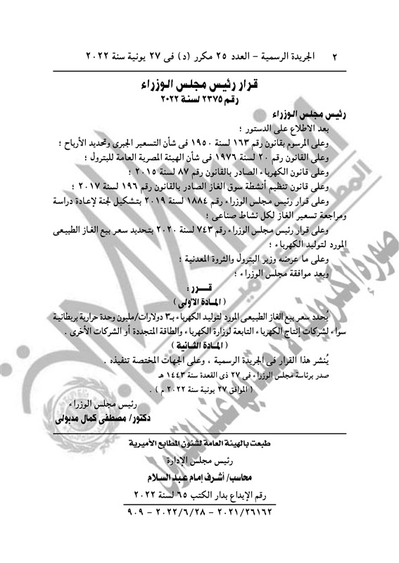 كما نشرت الجريدة الرسمية في العدد 25 مكرر "د" بتاريخ 27 يونيو 2022، قرار رئيس مجلس الوزراء رقم 2375 لسنة 2022، بشأن تحديد سعر بيع الغاز الطبيعى المورد لتوليد الكهرباء بـ 3 دولارات/مليون وحدة حرارية بريطانية سواء لشركات إنتاج الكهرباء التابعة لوزارة الكهرباء والطاقة المتجددة او الشركات الأخرى.