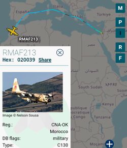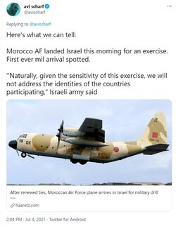 وأشار والا إلى أنه وثق هبوط الطائرة المغربية صباح اليوم، على مواقع تتبع الطائرات على الإنترنت، وهذه هي المرة الأولى التي تهبط فيها طائرة عسكرية مغربية في إسرائيل. ولم يتضح عدد الجنود وأفراد الطاقم على متن الطائرة ومدة بقائهم في البلاد. من جانبه، قال المتحدث باسم الجيش الإسرائيلي إن "الجيش يتعاون مع مجموعة متنوعة من الدول والجيوش الأجنبية، أثناء إجراء التدريبات والاجتماعات العليا والبحوث والتطورات المشتركة. ولن نتطرق إلى التعاون مع دولة معينة".