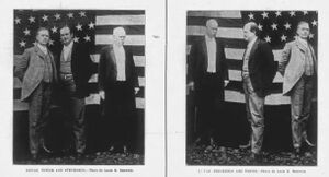 First photo, from left: Charles A. Towne, William Jennings Bryan, and Stevenson. Second photo, from left: Stevenson, Bryan, and Towne. Both photos taken in July 1900.