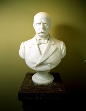 There is a bust of Stevenson in the United States Capitol Building as part of the United States Senate Vice Presidential Bust Collection. It was sculpted in 1894 by Franklin Simmons.[20][19] The bust originally sat on a gallery-level niche in the Senate chamber, but in 1910 the bust collection was reorganized, and Stevenson's bust was placed in the main Senate corridor.[19] In 1991 it was moved to the opposite end of the corridor, which required moving the bust of Vice President Charles W. Fairbanks. Stevenson's bust was moved that time to make room for the incoming bust of then-president and former vice president George H. W. Bush.[28]