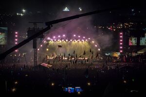 At the 2016 Brit Awards in London on 24 February, Adele received the awards for British Female Solo Artist, British Album of the Year for 25, British Single of the Year for "Hello", and British Global Success, bringing her Brit Award wins to eight.[108] She closed the ceremony by performing "When We Were Young", the second single from 25.[108] Two more singles from 25 were released in 2016: "Send My Love (To Your New Lover)" and "Water Under the Bridge". While on stage at London's O2 Arena on 17 March, Adele announced that she would be headlining on the Pyramid Stage at the 2016 Glastonbury Festival, which was later confirmed by the festival's organisers.[109] She appeared for a 90-minute fifteen song set at the festival on 25 June in front of 150,000 people, and described the experience as "by far, the best moment of my life so far".[110][111] In an interview with Jo Whiley on BBC Radio 2 around 30-minutes before going on stage, Adele had said she had been going to Glastonbury since she was a child and that the festival had meant a lot to her, before she broke down. Whiley recalls, "She was really scared, really, really scared. We were doing the interview and at one point she had to stop as she was in tears. It was amazing to see somebody like that, then to witness her walking out on stage and doing the most incredible set. To know that half an hour before she’d been in tears at the thought of walking out there."[102]