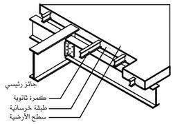 - الأرضيات المعدنية: وهي أرضيات يتم إنشاؤها من كمرات معدنية ثانوية ترتكز على جيزان معدنية رئيسة تستند إلى الجدران أو الأعمدة. وتكون الكمرات الثانوية في العادة من القضبان المُجَنبة ذات المقاطع Profile الصغيرة بشكل I أو بشكل T. وتكون الجيزان الرئيسة في العادة من القضبان المجنبة ذات المقاطع المركبة أو المفردة الكبيرة بشكل I.