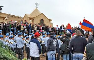 Armenians in Syria are present in both rural and Urban areas. The villages of Kessab and Yakubiyah and Ghnemiyeh had Armenian majority prior to the civil war, and both are located near the contested border region of Hatay Province.[9] Kessab was attacked and looted in an ambush by Syrian Rebels who were given passage through Hatay province by Turkey,(although they deny this claim) and Yacubiyah had their Armenian population expelled by Al Nusra.[10][11] Excluding those villages, Armenians are primarily urban. Most Armenians of Syria live in Aleppo, with other cities including Latakia, Damascus, Qamishli, Raqqa, Tell Abyad, Al-Hasakah, Deir ez Zor, Al-Malikiyah and Ras al-Ayn, although some of which have had their populations expelled such as Raqqa and Deir ez Zor. In 2015, the local St. Rita Catholic Armenian church was also destroyed, according to unconfirmed reports at that time, by rebel fighters.[22]