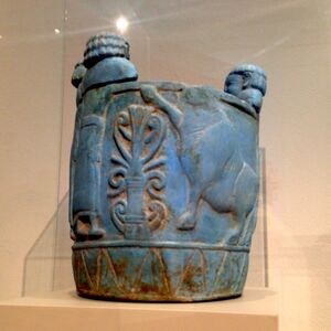 Pyxis made out of "Egyptian blue" faience): Imported to Italy from northern Syria, it was produced 750–700 BC. (Shown at Altes Museum in Berlin)