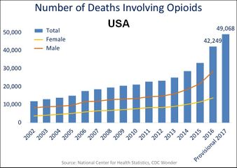على الرغم من زيادة استخدام المسكنات، إلا أنه لم يحدث أي تغيير في نسبة حالات الألم المزمن المبلغ عنها في الولايات المتحدة.[16][17] ومع ذلك، أصبح وباء الأفيون الحالي أسوأ أزمة مخدرات في التاريخ الأمريكي. توفي أكثر من 33،000 شخص بسبب الجرعات الزائدة في عام 2015، أي ما يعادل تقريبًا عدد الوفيات الناجمة عن حوادث السيارات، مع وفيات من الهيروين وحدها أكثر من حوادث القتل.[18] كما أنه يترك الآلاف من الأطفال يحتاجون فجأة إلى الرعاية البديلة بعد وفاة والديهم بسبب الجرعات زائدة مما يخلق مشكة جديدة خاصة بهؤلاء الأطفال اليتامى.[19]