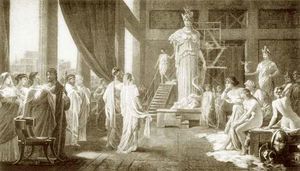 رسم بريشة هكتور لرو (1682–1740)، التي تصور أسپاسيا وپركليس يبديان إعجابهما بتمثال ضخم لأثينا في ستوديو فيدياس.