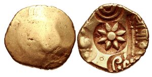 Coinage of Yadavas of Devagiri, king Bhillama V (1185-1193). Central lotus blossom, two shri signs, elephant, conch, and “[Bhilla]/madeva” in Devanagari above arrow right | |||||||||||