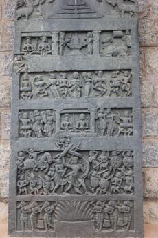 The dynasty claimed descent from Yadu, a legendary hero mentioned in the Puranas.[8] According to this account, found in Hemadri's Vratakhanda as well as several inscriptions,[3] their ancestors originally resided at Mathura, and then migrated to Dvaraka (Dvaravati) in present-day Gujarat. A Jain legend states that the Jain saint Jinaprabhasuri saved the pregnant mother of the dynasty's founder Dridhaprahara from a great fire that destroyed Dvaraka. A family feudatory to the Yadavas migrated from Vallabhi (also in present-day Gujarat) to Khandesh. But otherwise, no historical evidence corroborates their connection to Dvaraka. The dynasty never tried to conquer Dvaraka, or establish any political or cultural connections with that region.[8] Its rulers started claiming to be descendants of Yadu and migrants from Dvaraka after becoming politically prominent.[9] Dvaraka was associated with Yadu's descendants, and the dynasty's claim of connection with that city may simply be a result of their claim of descent from Yadu rather than their actual geographic origin.[10] The Hoysalas, the southern neighbours of the dynasty, similarly claimed descent from Yadu and claimed to be the former lords of Dvaraka.[9] But there are no early records directly linking the Seuna Yadavas and Hoysala Yadavas to the Yadavas of North India.[11][12]