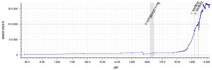By 1914, Osnabrück had over 70,000 inhabitants.[11] The outbreak of the First World War necessitated food rationing; the Allied blockade and a harsh winter in 1917 led to further shortages.[13] Following Germany's defeat in 1918, a council made up of workers and soldiers took control during the November Revolution, but were replaced by the new Weimar Republic the following year.[14] Similarly to many other German cities, Osnabrück experienced considerable inflation and unemployment in the 1920s, with over 2,000 out of work by 1923 and nearly 14,000 receiving some form of government assistance by 1928.[15]