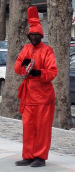 In the early 20th century, a group of African-American laborers began a marching club in the New Orleans Mardi Gras parade, dressed as hobos and calling themselves "The Tramps". Wanting a flashier look, they renamed themselves "Zulus" and copied their costumes from a blackface vaudeville skit performed at a local black jazz club and cabaret.[61] The result is one of the best known and most striking krewes of Mardi Gras, the Zulu Social Aid and Pleasure Club. Dressed in grass skirts, top hat and exaggerated makeup, the Zulus of New Orleans are controversial as well as popular.[62] The group has, since the 1960s, argued that the black and white makeup they continue to wear is not blackface.