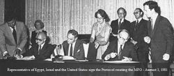 ممثلو مصر وإسرائيل والولايات المتحدة يوقعون البروتوكول المنشئ للقوة متعددة الجنسيات والمراقبون، 3 أغسطس 1981.