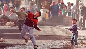 أطفال فلسطينيون يرمون الأحجار على جنود الاحتلال في الانتفاضة.