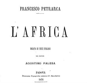 - English, 1874. Africa Francisci Petrarcæ nunc primum emendata curante, by Francesco Corradini, Padua.