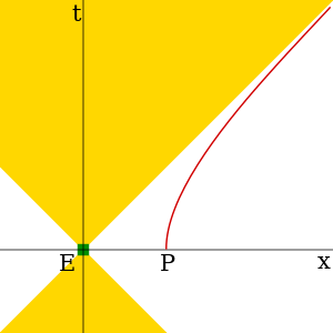 مخطط الزمكان يوضح الجسيم المتسارع بشكل موحد، P، والحدث E الذي يقع خارج أفق الجسيم الظاهري. قمع الضوء الأمامي للحدث لا يتقاطع أبداً مع خط عالم الجسيم