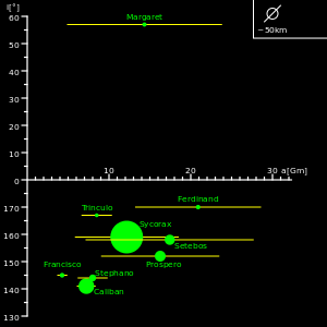- ^ Negative orbital periods indicate a retrograde orbit around Uranus (opposite to the planet's rotation).