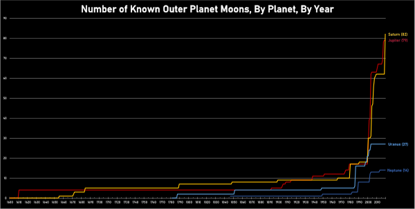 William Herschel discovered the first two moons, Titania and Oberon, in 1787. The other three ellipsoidal moons were discovered in 1851 by William Lassell (Ariel and Umbriel) and in 1948 by Gerard Kuiper (Miranda).[1] These five may be in hydrostatic equilibrium, and so would be considered dwarf planets if they were in direct orbit about the Sun. The remaining moons were discovered after 1985, either during the Voyager 2 flyby mission or with the aid of advanced Earth-based telescopes.[2][3]