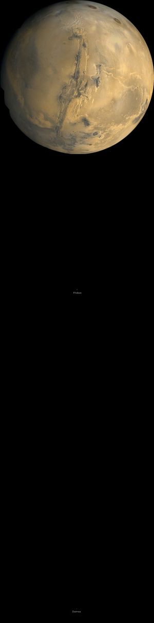 12.6 كم (10×12×16) | 2×1015 | 23 460 كم | 30.35 | 131 h (5.44 d) | صور متحركة لفوبوس وديموس. | |