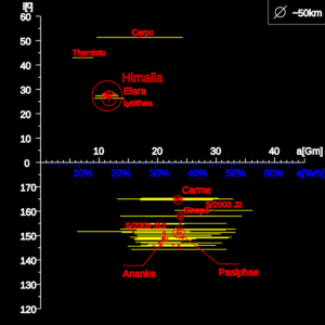 11 | VI | Himalia | [] | 170 | 670 | 11,451,971 | +250.37 | 30.486° | 0.1513 | 1904 | Perrine | Himalia | |