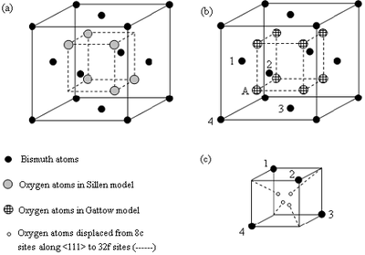 (a) Sillen model; vacancies ordered along<111>, (b) Gattow model; vacancies completely disordered in oxygen sub-lattice, with each oxygen site having 75% occupancy, (c) Willis model; oxygen atoms displaced from regular 8c sites (for example, the atom marked A in (b)) along<111> to 32f sites. The Bi3+ ions labelled 1-4 in (c) correspond to those labelled 1-4 in (b).