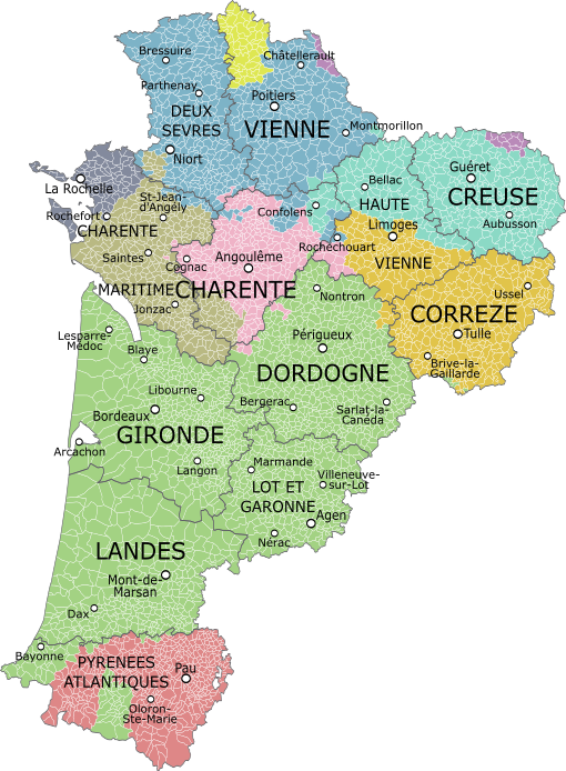 يضم Nouvelle-Aquitaine اثني عشر إقليماً: شارنت، شارينت البحرية، كوريز، كريوز، دوردونيه، جيروند، لاندز، لوت گارون، الپرانس الأطلسية، دوكس سيفر، ڤيين وڤيين العليا .