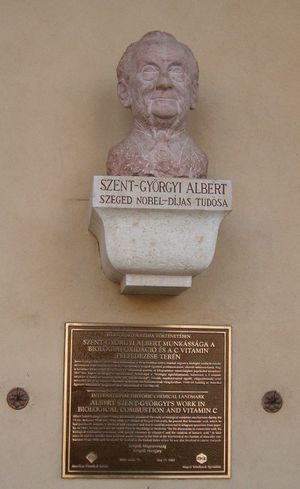 ألبرت سنت گيورگي ناگيرا (Albert Imre Szent-Györgyi؛[أ] de Nagyrápolt (مجرية: nagyrápolti Szent-Györgyi Albert Imre و. 16 سبتمبر 1893 - ت. 22 أكتوبر 1986)، كان عالم كيمياء حيوية مجري حصل على جائزة نوبل في الفسيولوجيا أو الطب عام 1937 لاكتشافه فيتامين ج ومكونات وردود فعل دورة حمض الستريك،[5] والقاعدة الجزيئية لـ انقباض العضلات. وكان من المقاومين المجر النشطين أثناء الحرب العالمية الثانية ودخل السياسية المجرية بعد الحرب.[6]
