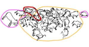 Human occupation was limited to the cave mouth, although paintings were created throughout the length of the cave. The artists used charcoal and ochre or hematite to create the images, often diluting these pigments to produce variations in intensity and creating an impression of chiaroscuro. They also exploited the natural contours of the cave walls to give their subjects a three-dimensional effect. The Polychrome Ceiling is the most impressive feature of the cave, depicting a herd of extinct steppe bison (Bison priscus[3]) in different poses, two horses, a large doe, and possibly a wild boar.