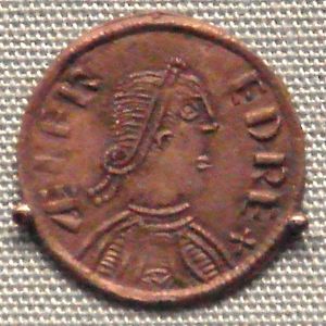 Alfred the Great silver offering penny, 871–899. Legend: AELFRED REX SAXONUM "Ælfred King of the Saxons".
