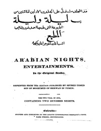 حكايات في عالم مشغول بالسحر والسحره، صاخب إلى ابلغ درجات الصخب والهوس والعربده، ماجن إلى آخر حد، مجنون مفتون، نابض بالحياة والخلق والحكمه والطرب يميل بعض النقاد إلى الاعتقاد بأن واضع هذا الكتاب ليس فردا واحدا بالرغم من إجماعهم على ان أصل ألف ليله وليله فارسي. ويميل بعضهم إلى الجزم بأن اصل الكتاب هندي مع إقرار ببعض فضل للفرس والعرب فيه فهناك حكايات عديده نسبت إلى الهند وبلاد فارس وحكايات تنسب إلى بغداد. وقد كتب محسن جاسم الموسوي في مقدمة طبعة ا. ي. بريل عام 1984 أنه "بعد أن انتقلت نسخة الكتاب الخطية بين الشام ومصر مدة تزيد على أربعة قرون من الزمن، وترجم من نسخ خطية إلى اللغة التركية والفرنسية والإنجليزية، وظهرت منه مقتطفات مطبوعة في انجلترا في نهاية القرن الثامن عشر من الميلاد، طبع الكتاب لأول مرة في كلكتا في الهند في جزئين، في المطبعة الهندوستانية وبرعاية كلية فورت وليم - الجزء الأول بعنوان "حكايات مائة ليلة من ألف ليلة وليلة" عام 1814 م، والجزء الثاني بعنوان "المجلد الثاني من كتاب ألف ليلة وليلة يشتمل على حكايات مائة ليلة وأخبار السندباد مع الهندباد" عام 1818 م - نشره الشيخ أحمد بن محمود شيرواني اليماني أحد أعضاء هيئة التدريس في قسم اللغة العربية في الكلية المذكورة. وقد اقتصر الناشر على وضع مقدمة موجزة باللغة الفارسية ذات الأسلوب الهندي في أول كل واحد من الجزئين هذا نصها وترجمتها: