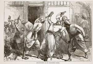The situation with the rioters continued to deteriorate as they set fire to the compound stables. A single shot was fired from the crowd and Major Broadfoot, standing beside Burnes on the balcony, was killed. Now assured that there was no longer a chance for rescue, Charles Burnes exited, armed, into the courtyard, reportedly killing six men before being hacked to death. Alexander Burnes was soon beaten and hacked to death by the mob. The events took place just half an hour's march from where the British troops had been stationed. One young officer, recording the event in his journal, noted "When 300 men would have been sufficient in the morning, 3000 would not have been adequate in the afternoon."[19]