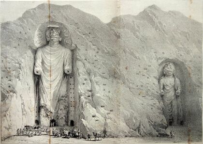 Engraving of the Buddhas of Bamiyan, as Burnes saw them during his visit to Bamiyan in 1832; they have since been destroyed.
