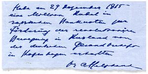 سند استلام پارڤوس مبلغ 1 مليون روبل: "استلمت في 29 ديسمبر 1915، واحد مليون روبل نقداً لاحتياجات الحركة الثورية في روسيا من المبعوث الألماني في كوبنهاگن، الدكتور أ. گلفاند