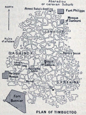 مخطط تنبكتو حوالي عام 1896، يُظهر المنزل الذي تعافى فيه لينگ، بين مسجدي جينگربر وسيدي يحيى.